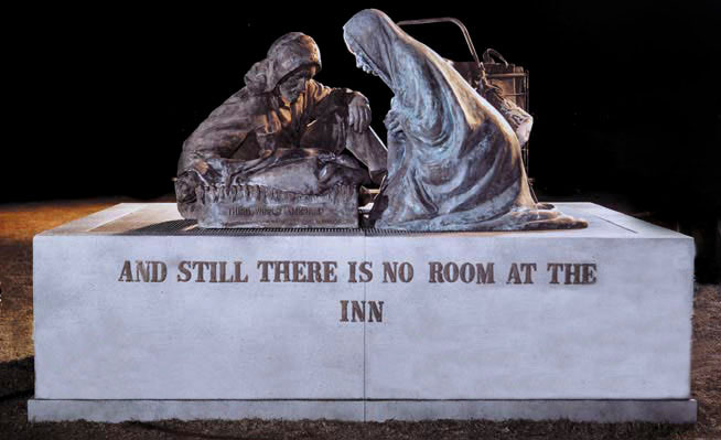 Snyder and fellow CCNV members conceived the idea for the nature of the display: a sculpture of a modern Nativity scene in which, in lieu of the traditional Holy Family, the two adult figures and the infant would appear as contemporary homeless people huddled on a streetside steam grate. The family was to be black (most of the homeless in Washington being black); the figures were to be life-sized, and the steam grate would be positioned atop a platform “pedestal,” or base, within which special effects equipment would be enclosed to emit simulated “steam” through the grid to swirl about the figures. They also settled upon a title for the work — “Third World America” — and a legend for the pedestal: “and still there is no room at the inn.”
